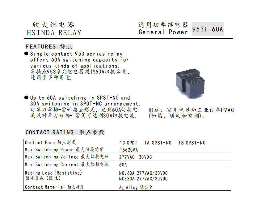 单接点953系列继电器提供60A切换容量,适用于多种用途.