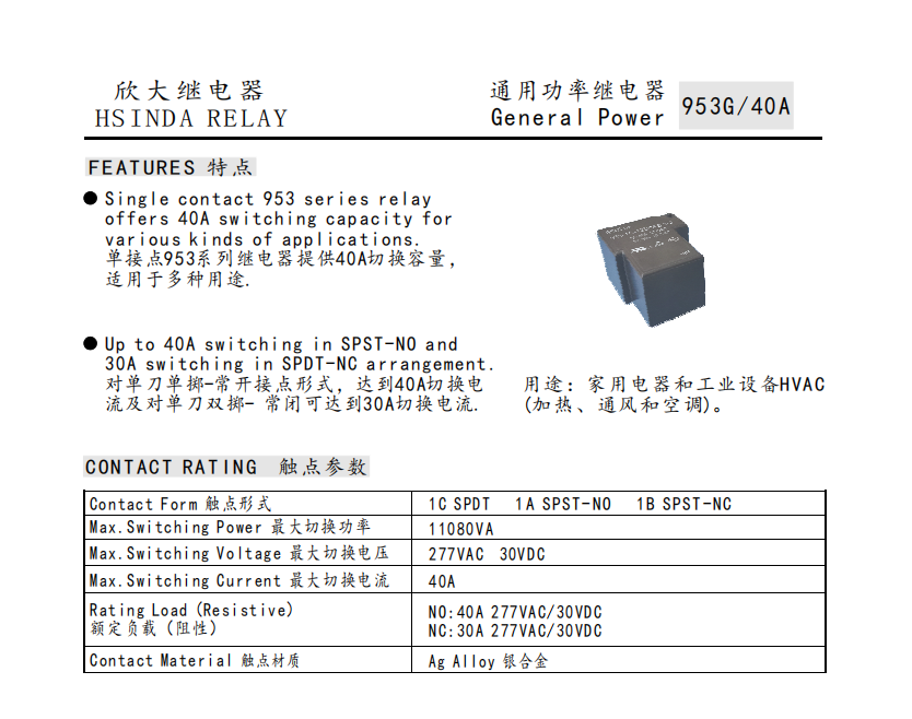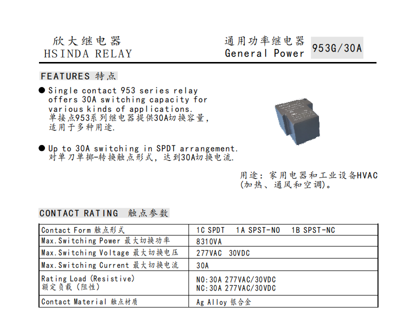 单接点953系列继电器提供30A切换容量,适用于多种用途.